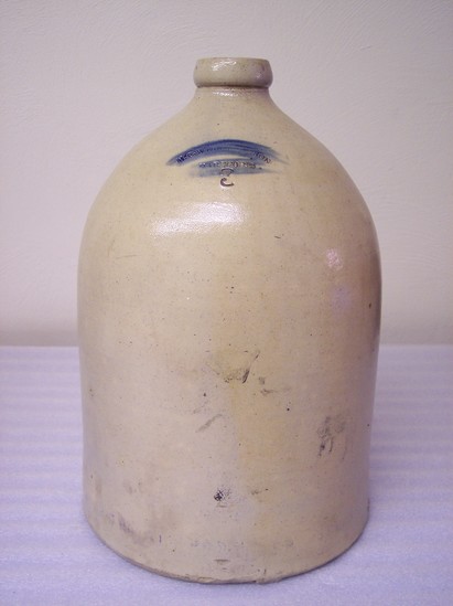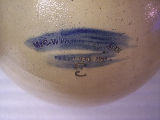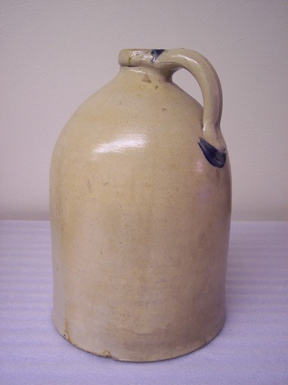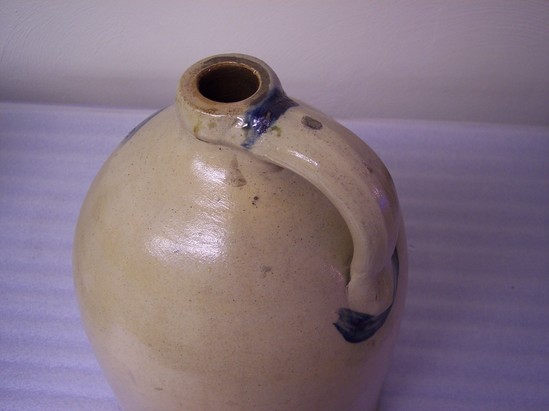 Salt-glazed jug with touches of cobalt blue at rim and over mark. High shoulder with slightly flared base. Handle applied from rim to shoulder. Incised circle at base.