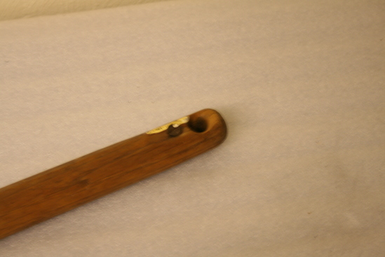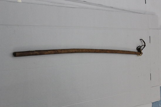 Round wooden stick. Hole at one end with steel screw underneath. Leather flail missing