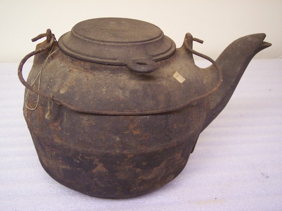 Round stepped bottom for fitting into hole in top of stove. Straight sides with band at neck and rounded top, flowering shaped spout, with step lid flat topped. Two knobs for handle