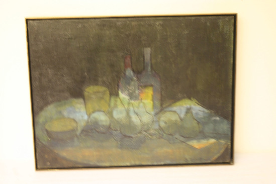 A somber colored study of pears, a glass and 2 bottles on a table. Dark green background, lighter greens and blues for objects. The paint is thick, put on with a wide brush and then worked over with smaller brush. Delineation done over paint with thin black lines, quickly done, making almost geometrical forms. Low keyed, no highlights, cold colors with only warmth in patch of yellow and touch of orange worked in foreground and on side of one bottle. Gold metal frame. Signed in lower right hand corner "S. Mortimer"