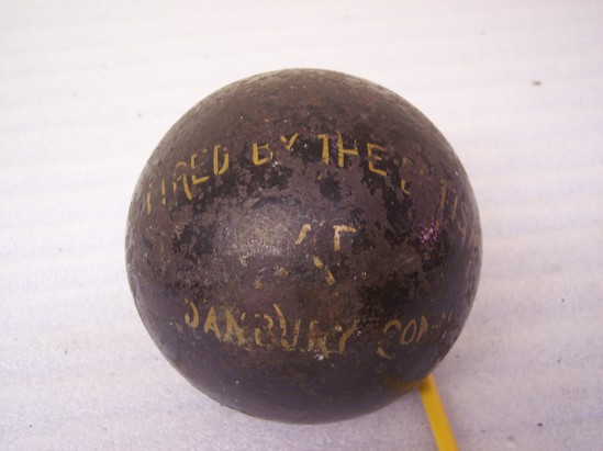 A: Fired by the British on Danbury, Conn on April 26th, 1777 B: brought home from the Battle of Cold Harbor by Myron Kilbourn Co. A, 2nd Conn. Volunteer Heavy Artillery who lost three fingers in the battle