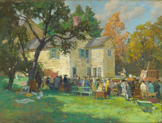 A scene of a country auction which is being held to the south east of the house known as "The Glebe" on North St. in Litchfield. A small crowd is gathered under two trees. The artist has taken some liberties with the perspective of the house itself since the service wings appear to be attached to the gable end of the main block while in fact they are constructed with their gables running east and west to the house proper. The house is painted a yellowish cream color with green louvered shutters and brick chimneys. The auctioneer stands on an elevated platform to right of center and an articles to be auctioned are sitting throughout the yard - a cupboard with glazed doors, a bench painted light green, a three drawer chest with French feet and various utilitarian objects such as a wash basin and bowl. Pastel is framed under glass. Frame is gold painted wood.
