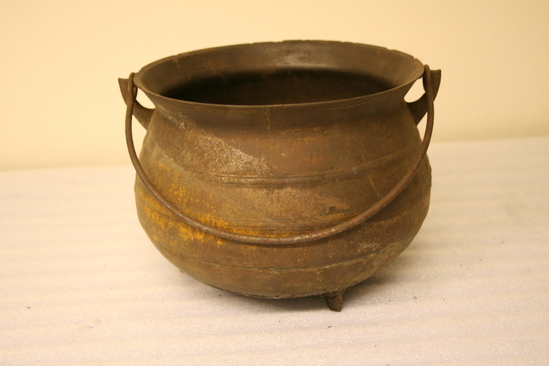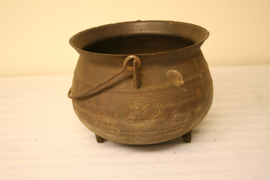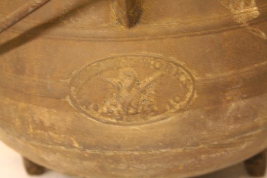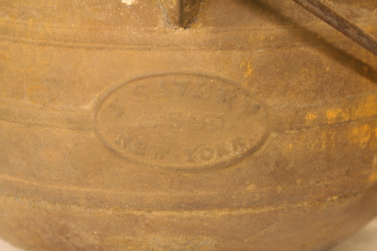 Three legged with round body and flared deep rim; three bands horizontally on outside of kettle; stamp on each side - "Phoenix Work" on one and "J.S. Savery & Son New York" on other