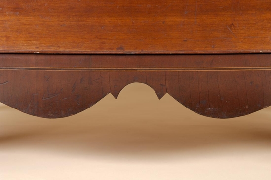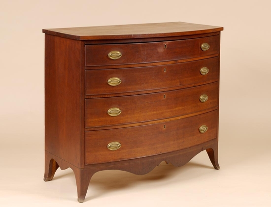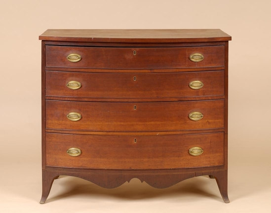 Bow front, four graduated drawers, sabre feet, swag and scroll front skirt. Two inlaid lines on base--beaded edge to drawers, key holes with brass edges, two oval pulls with half-moon bails stamped "HJ" on each drawer. Signature of "Pierpont Jr" on underside of one drawer in pencil