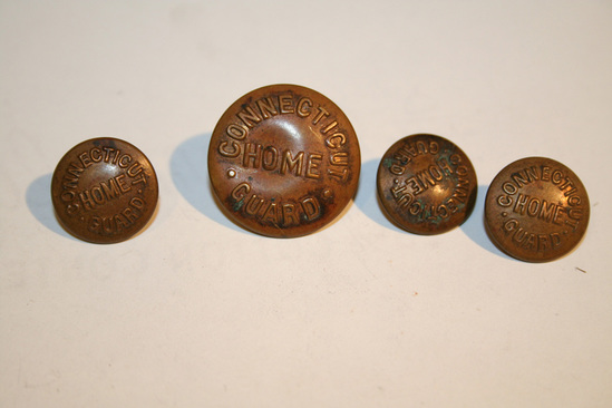 Brass button molded with Connecticut Home Guard on the front and stamped with Scovill Mfg Co. Waterbuty on the back.