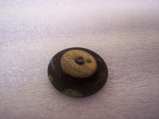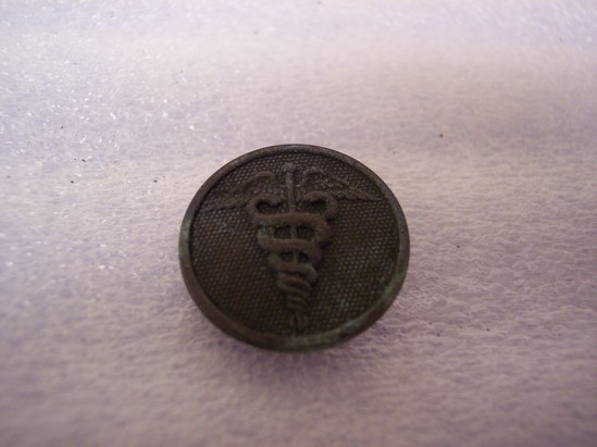 Round brass button with caduceus symbol on front - two serpents wrapped around a pole with eagles wings on top
