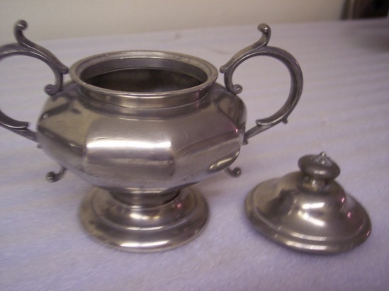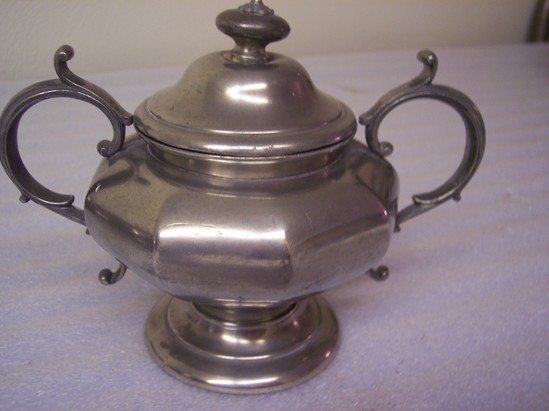 Round base, octagonal paneled bulbous body with round rim supporting domed lid with button finial with flower on top. 2 handled finial with brass screw shaft and brass wing nut. Markings on bottom "J.P./Broadhead & Co./Sheffield"