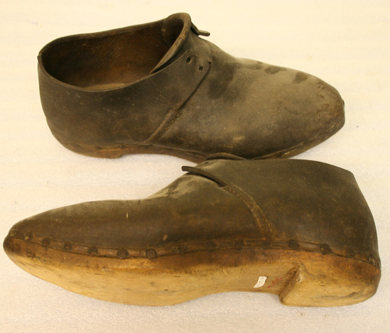 Leather shoes with wooden soles; large head tacks spaced at 3/4" on center; two holes on each side of shoe for laces. Rounded toe. Tongue at center with two overlapping pieces of leather with two holes on each side for laces to be woven through. No lining.