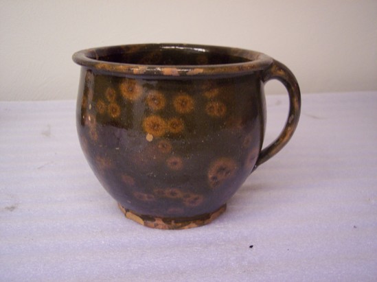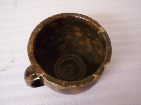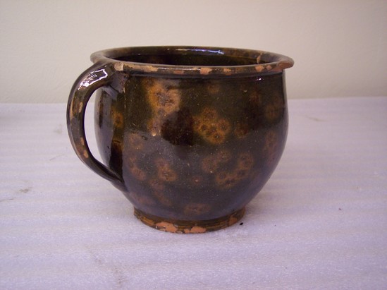 DARK GREEN GLAZE ON INTERIOR AND EXTERIOR WITH DARK BROWN AND YELLOW SPOTS. RIM ROLLED, FLATTENED. SHAPED BASE. EAR-SHAPED HANDLE. THIS IS A CHILD'S CHAMBERPOT.