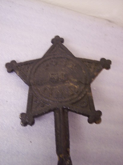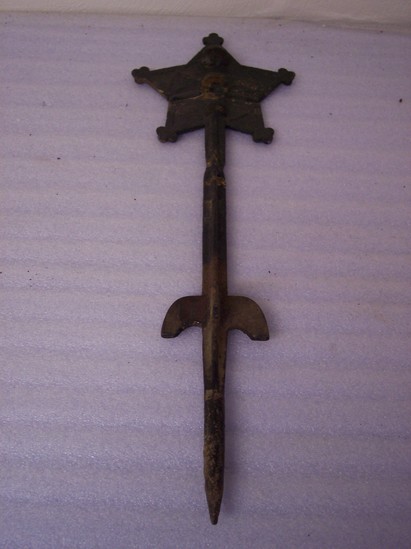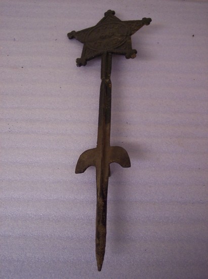 Two iron bars soldered together to make a cross form. At top is a five point trefoil star with gothic designs. Rings on back to hold flag. Inscription on front "POST/80/GAR"