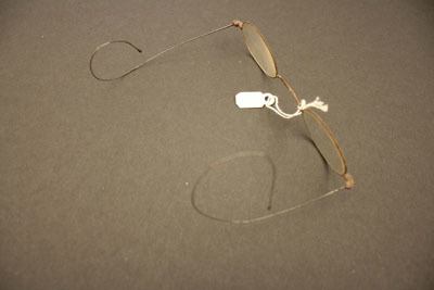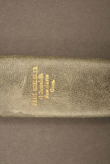 Eyeglasses have oval lenses with steel frames, the bows are of steel wire. Case - stiff cardboard covered with black leather. In gold letters "Paul Roessler/71 Church St./New Haven/Conn."