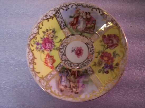 Ring base with flared sides. Designed with four panels, alternating floral panels with panels of women in celebration. In the center of the plate is a single, pink flower. Gilt scrollwork around rim, in center, between panels. Transfer print.