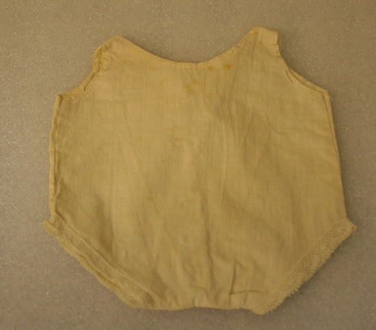 Doll's combination - white muslin trimmed with cotton lace, boat neck and arm holes bound, lace trim at diagonally cut legs