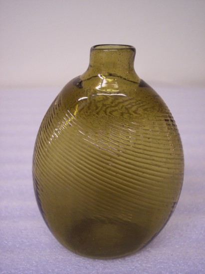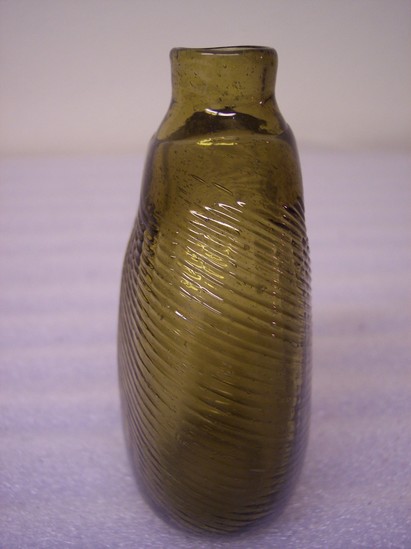 Light olive green glass bottle, 1/2 pint size, blown, two insertions, swirling pattern made by twisting after second insertion.