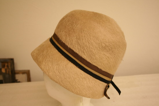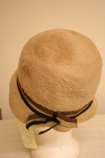 Circular hat with rounded crown and brim angled down; tan fur texture with three over lapping ribbons around base of crown - brown, beige and black; ribbons across front and form bow in back; tan grosgrain band inside with black embroidered "F"