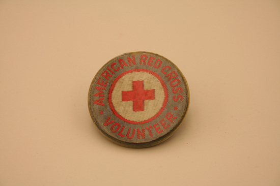 Round pin, front is a piece of stitched fabric with plastic cover. Grey border, white center with thin red line around it. Red cross in center. Around edge "American Red Cross/Volunteer"
