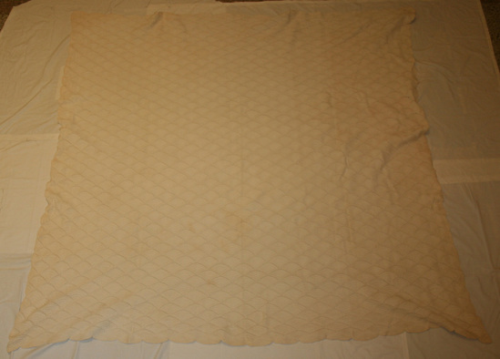 Hand knit/crocheted coverlet of white cotton. 4 ribbed shell design with ties at each point. All edges scalloped.