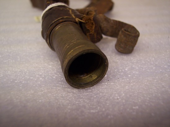 Leather shot belt. Long strap of leather; buckle on one side where strap can be adjusted. Other end of strap is thicker at one point. A larger piece of leather has wrapped and stitched over thinner strap. At end of belt is a metal (brass) cylinder. One end of cylinder attached to belt and other end open. Three lines incised into cylinder for decorative effect