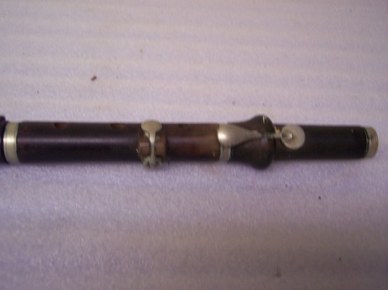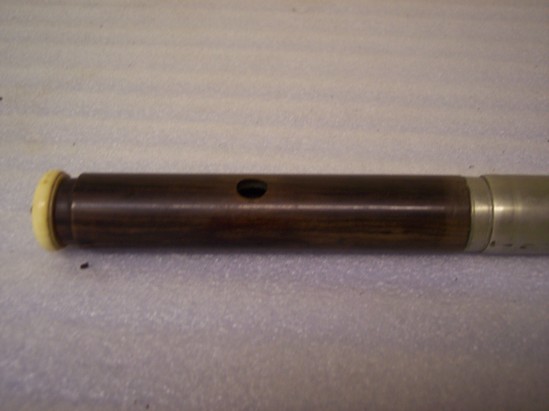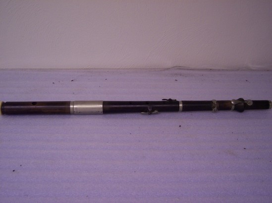 Wood flute, 4 sections, 4 silver keys, ivory end, 3 narrow silver bands, 1 wide silver band,
