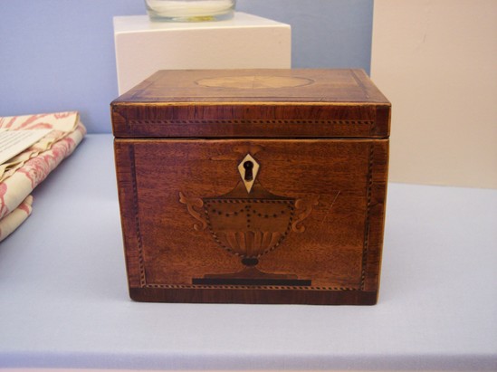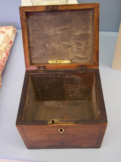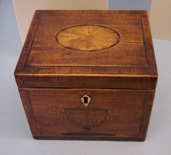 Small wooden box with inlaid design. Lid of box had inlaid oval design. Front of box has inlaid design of urn. Diamond shaped lock on front of box. Hinged lid. Interior lined with metal sheeting.