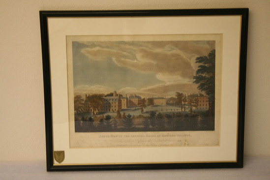 Hand colored engraving or aquatint of "South View of the Several Halls of Harvard College" "Taken from the Balcony of the President's House" Includes images of "Mass. Hall, Harvard Hall, Hellis, Hall, Stoughton Hall, Holwrthy Hall, University Hall." Fisher Pinxt, Annin and Smith Sc, Published by Cummings Hillard & Co., Boston, May 1, 1823.