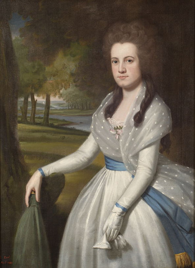 Oil on canvas portrait of Mariann Wolcott, 3/4 length portrait of a woman standing turned to the left, brown hair and hazel eyes, her left arm resting on the top of a green parasol, her right hand holding a glove, wearing a white silk dress with long sleeves, a blue waist sash and wristbands, white gloves and white lace shawl with roses pinned to her chest. She stands in a landscape of distant rolling hills with a stream