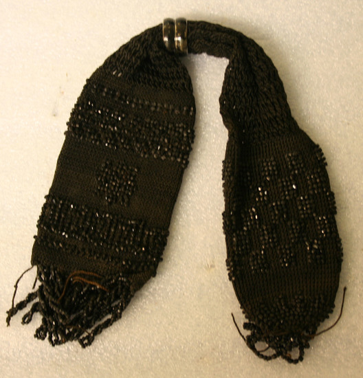 Black knit silk miser's purse. Long tubular body. One side has rounded end and the other is squared off at corners. Each end decorated with black glass beads. Fringe on both ends. Opening in center. Two metal rings painted black around circumference of body. No lining.