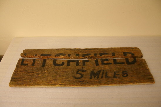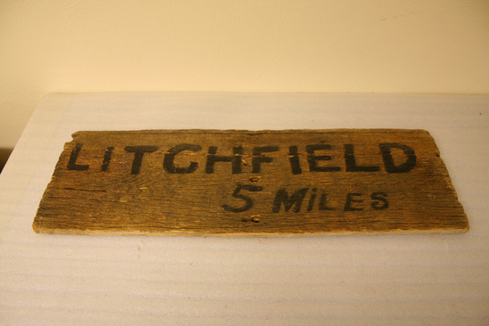 Toll Road or Mile Marker sign, one of a pair, from the toll house in Gooseboro (in Bantam) on old Route 202. Unpainted rectangular plank sign with black block lettering: "Litchfield / 5 miles" Probably from 1900-1920.