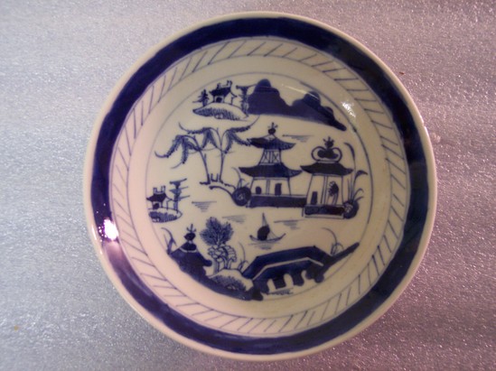White saucer with blue-banded rim and an Asian scene of two houses, trees, and birds. Slightly darker blue coloration than the other saucers.
