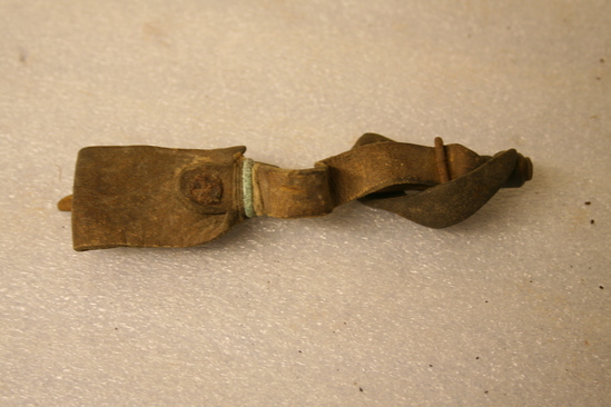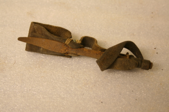 3 cornhusking pegs. Iron blade, swivel at top and curved and point at end. Leather loops attached. Finger and thumb fit into loops, are adjustable. Used to husk corn. "Boss Manufacturing Co., Kewanee, IL" stamped in leather
