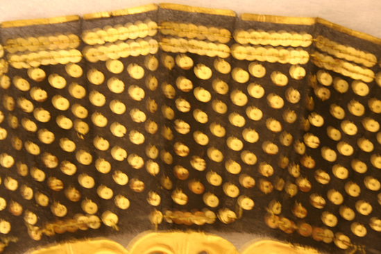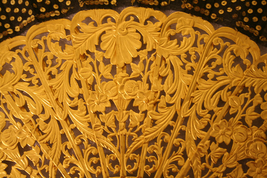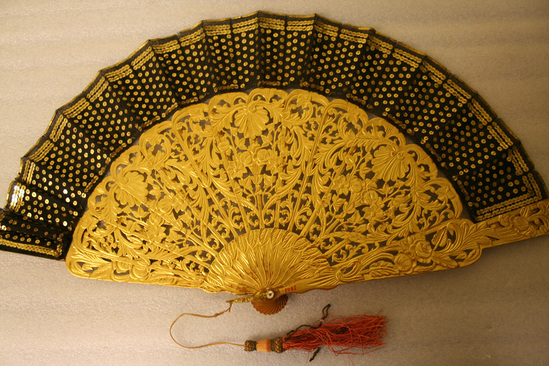 Wooden fan. Each stretcher runs 3/4 length of fan and is highly carved and gilded. Top 1/4 of fan is black fabric covered in gold sequins. Metal gold ring at bottom with red and black tassel.