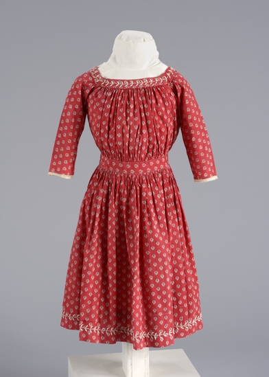 Red floral cotton calico cotton child's dress; long straight sleeves with lace trim; square neckline; gathered front and back bodice; lined waistband; embroidery at neckline and hem; center back opening with hook and thread loop