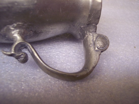 Crudely decorated handle. S-Handle with bifurcated terminal. Rounded body, straight collar.