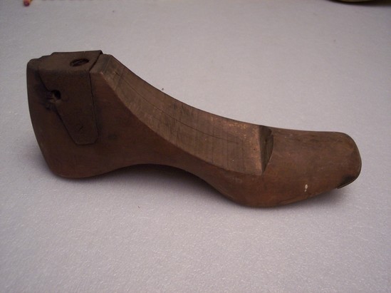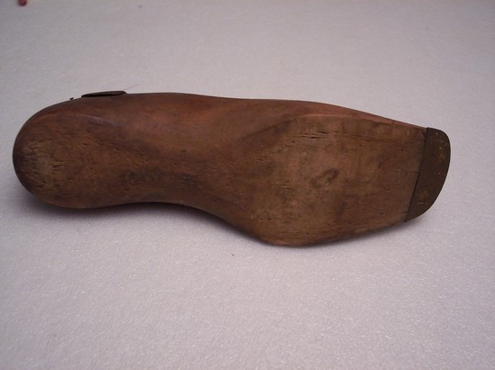Wooden shoe mold. Metal plate on bottom of toe and across top of mold (or "ankle" of mold) Mold has square shaped toe, high arch. Top of mold is cut out (insert would be placed there but missing) Hole drilled through heel of foot. Metal plates held on with screws. Metal tacks in bottom of mold.