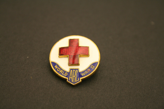 Round pin with small protrusion on bottom; gold on back, white enamel face with raised red cross in middle. Semi-circular border of blue at bottom. In gold lettering "World/ARC/War II"