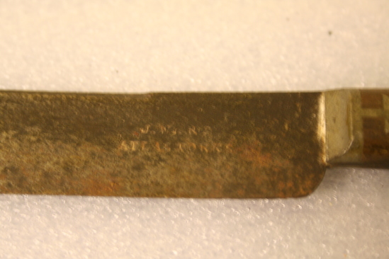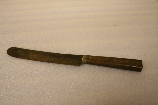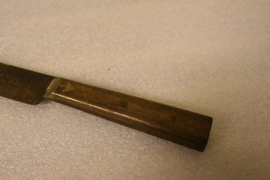 Mess knife used by Past Mid Shipman George B. Bissell, U.S. Navy, 1844-1848. The handle is dark stained hone with steel blade continuing through each side of riveted bandle with also has decorative steel insert at base in shape of arrow