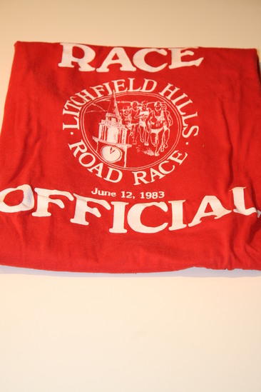 Red short sleeved t-shirt. Logo printed in center on front of shirt in white. Circle logo with runners and steeple or clock tower. "Litchfield Hills Road Race" printed around outer edge of logo. "Race" printed above logo. "Official" printed below logo.