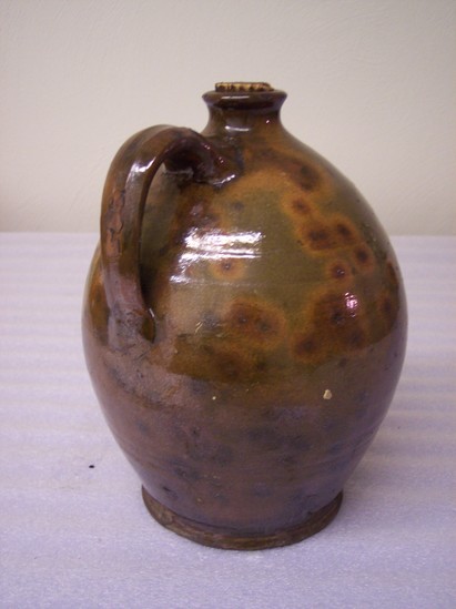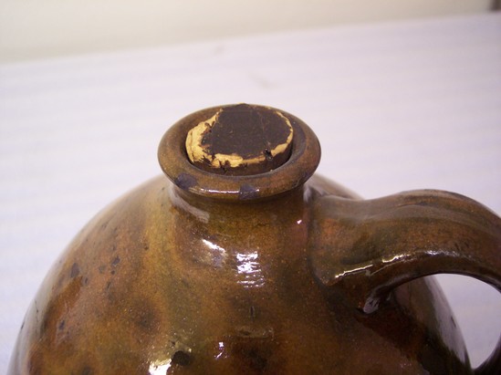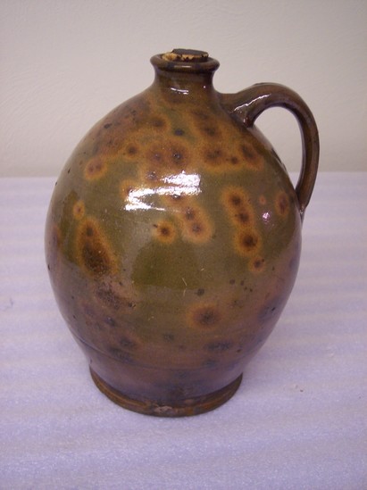 GREEN GLAZE WITH YELLOW AND BROWN SPLOTCHES. EAR-SHAPED HANDLE ATTACHED JUST BELOW MOUTH. MOUTH IS NARROW WITH SHAPED RIM, AND CONTAINS CORK. SHAPED BASE. SIDES CURVE OUT FROM RIM, TAPER TO BASE.