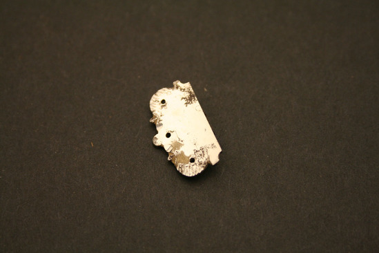Catch side of buckle or latch; straight edge on one side; curved design with various peaks; holes at opposite corners; rectangular bracket on underside of bracket
