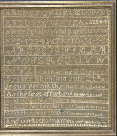 Off white and yellowish cotton stitching on brownish green linsey woolsey background. Sampler lists alphabet in both upper and lower cases and numbers 1 to 10. Printed twice in a row. "Catherine B. Ely aged/8 years Litchfield July 24th 1811/Jesus permit thy name to stand/As the first effort of an infants hand/And while her fingers over this canvas more/Engage her tender heart to seek thy love/with thy dear children let her share a part/And write thy name thyself upon her heart" Wood frame painted gold