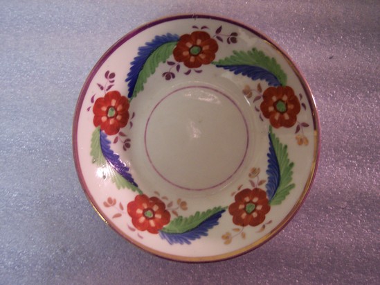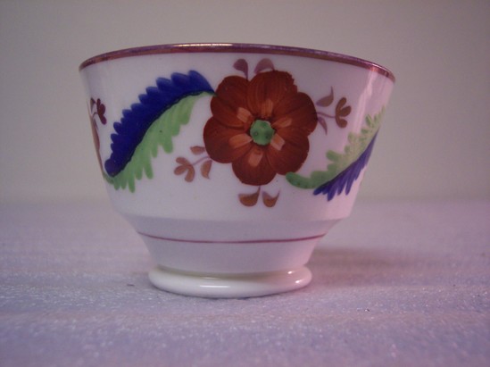 Lustreware cup and saucer, white base with red flowers, green and blue leaves, pink lustreware stripe banding. Purchased by Miss Quincy from the Brace estate, part of a tea service that belonged to Miss Sarah Pierce