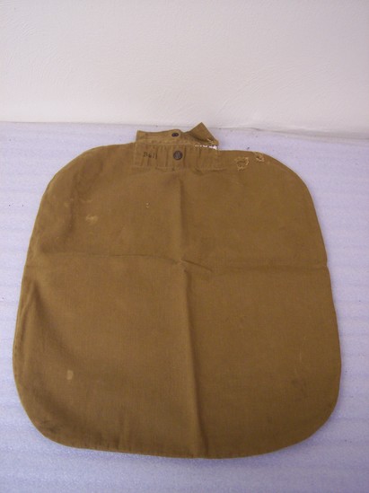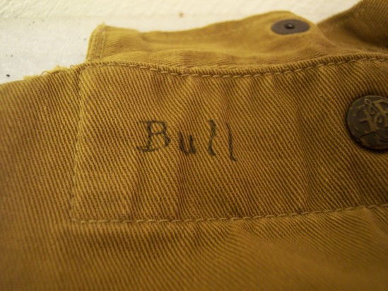 Rectangular cotton bag with rounded corners. Dull brown color. Small opening at one end with cloth lid which buttons to body of bag. "Bull" writen in ink on body of bag and inside of flap