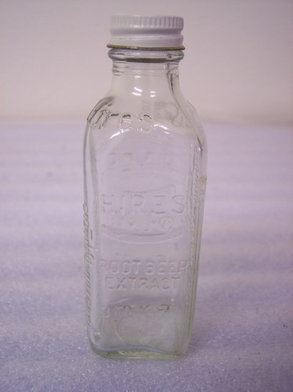 Clear glass bottle with metal screw top; raised lettering on all four sides. Front and reverse "Hires/Root Beer Extract/3 Fl. Oz" on sides "Hires Division Beverages/International, Inc./Evanston, Illinois" on reverse side "Contains Water, caramel/color, Natural and Artifical Flavors"