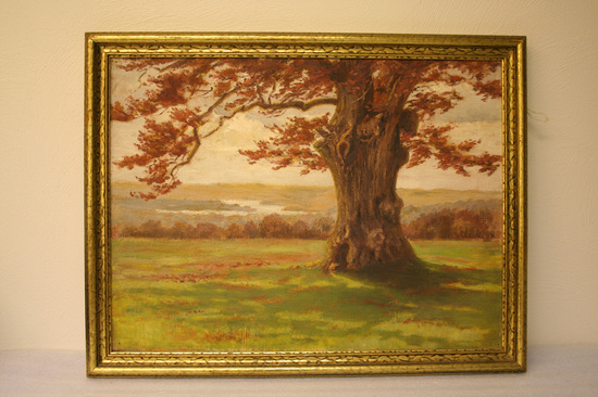 Oil on canvas of large oak tree. Red leaves on tree. Landscape in background. Green grass in foreground. Framed in wooden frame with gold leaf.