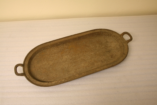 Long oval plan. Approximately 1" deep. Handle at two ends. Lip on edge of pan slightly raised.