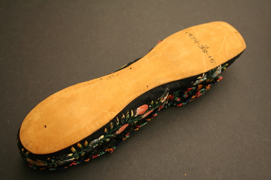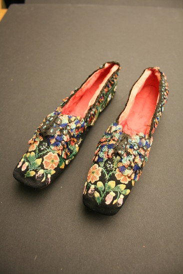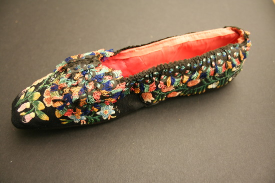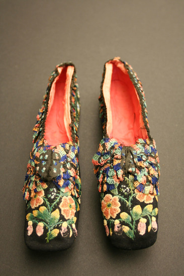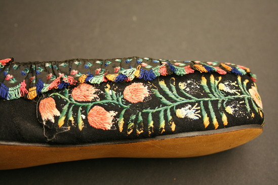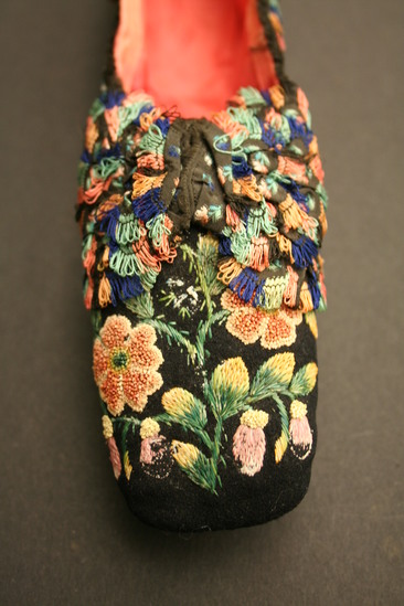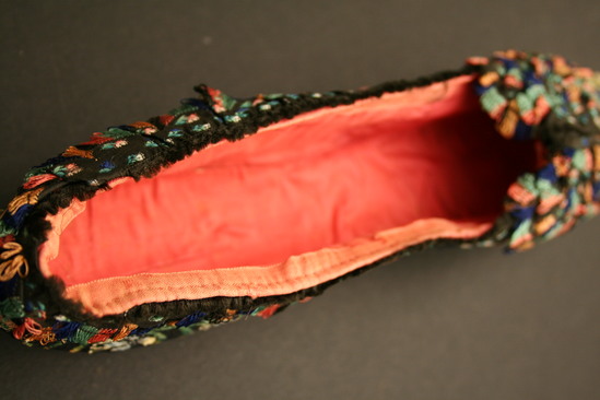 Black velvet slipper style shoe with pink satin lining; quill embroidery flowers all over; scalloped ruffle around opening in shoe with colored looped fringe on ends; bow on toe of shoe made of same scalloped edge fabric with looped fringe ends; bow has three layers