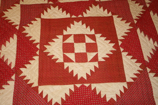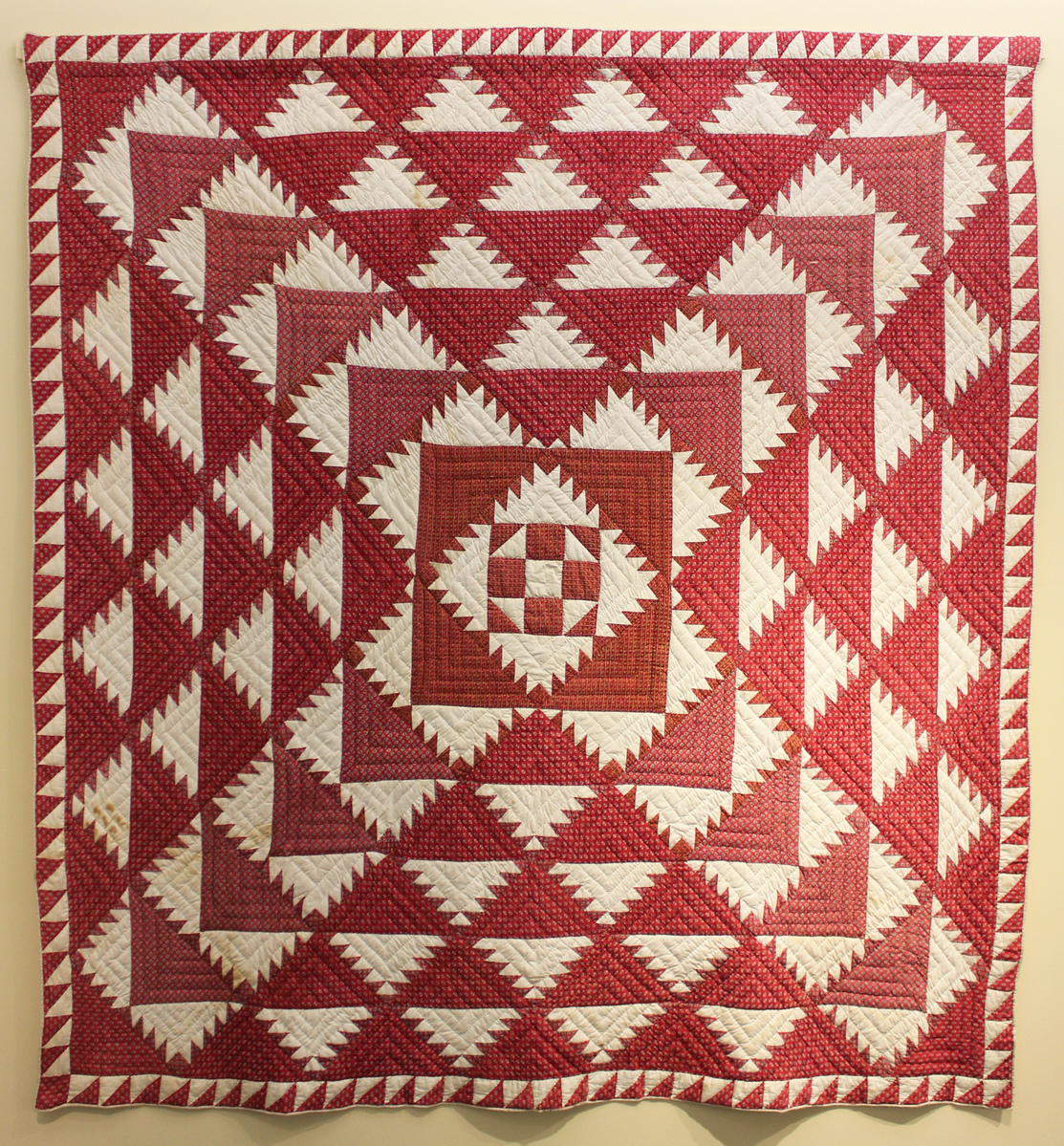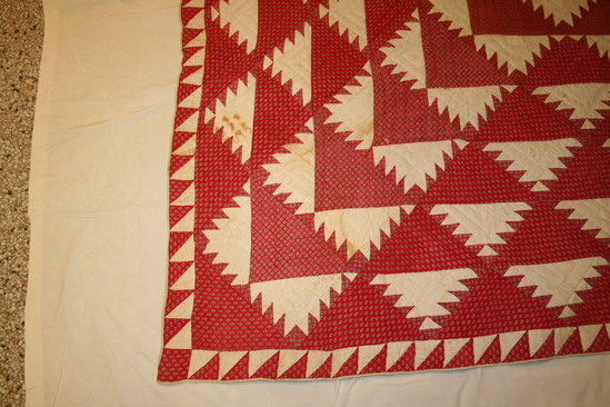 Patchwork quilted coverlet. Made of three roller printed red ground cottons—one with blue stylized flowers, one with blue oak leaves and stylized blue flowers, and one with yellow pin stripes and alternating green circles and green and yellow flowers—alternating with white. Worked into patterns including Shoofly in the center, Delectable Mountain overall, with a Saw Tooth border. Triangular quilting. Quilt backed with white coarse weave cotton.