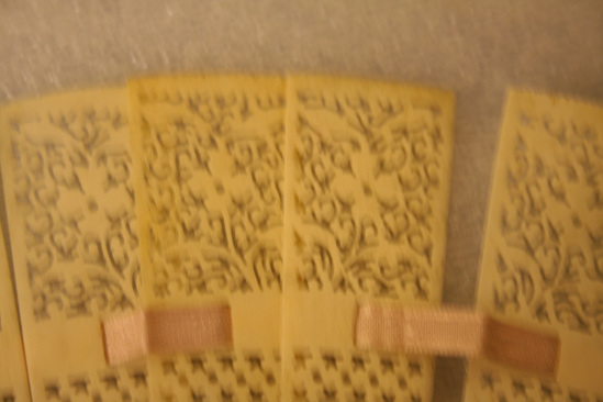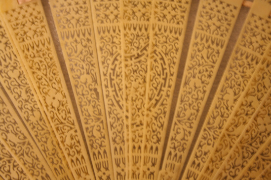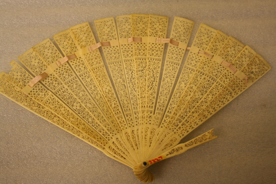 Elaborately pierced and carved ivory fan. Pink ribbon woven through top to hold stretchers together when fan opened.