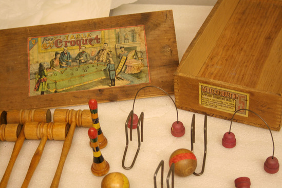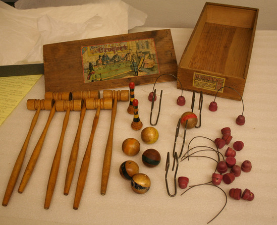 Wooden box with lid that slides off of top of box. Paper label on lid with image of six people playing table croquet game. Color image. Box contains 6 wooden mallets each 10 1/2" long; 6 wooden balls each 1 1/2" diameter; 7 metal wire wickets bent in semi-circular shape with small wooden wolders at bottom painted red; 2 wooden stakes each 3" long and 4 metal clamps designed to hold a belt around the game table to prevent the balls from rolling off. Belt is missing