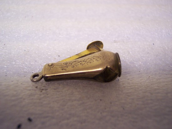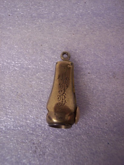 Copper alloy pill splitter with a bail for a chain (no chain present) engraved/monogramed on one side "MPB"